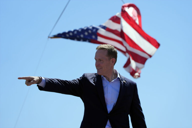 Reprezentant Ted Budd pred prejavom republikánskeho prezidentského kandidáta a bývalého prezidenta Donalda Trumpa. Foto: SITA/AP