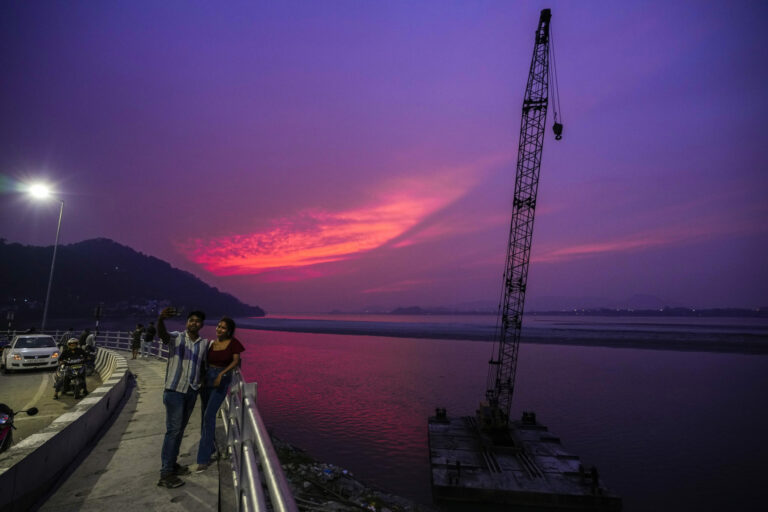 Pár pri rozostavanom moste cez rieku Brahmaputra v indickom meste Guwahati. Foto: SITA/AP