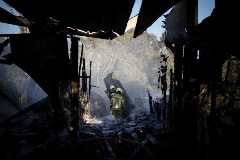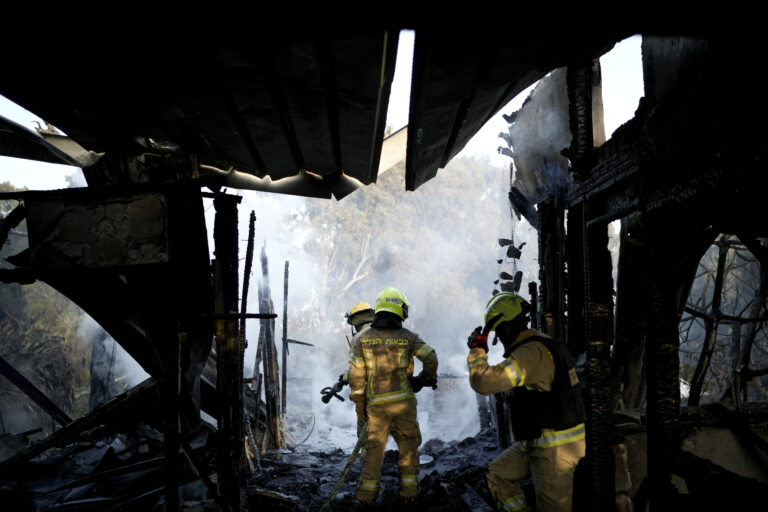 Izraelskí hasiči pracujú na dome, ktorý zasiahla raketa vypálená z Libanonu. Foto: SITA/AP