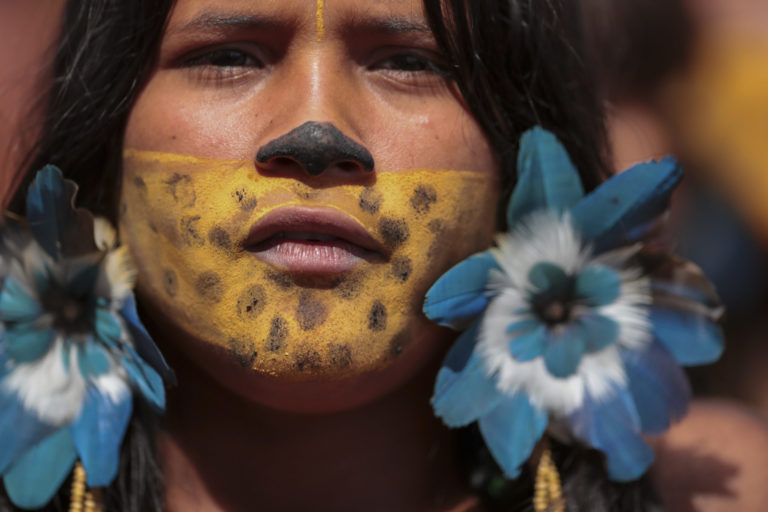 Žena počas podujatia domorodých obyvateľov Brazílie, ktorého cieľom je demonštrácia jednoty v boji za ich práva a vymedzenie hraníc ich území. 22. apríl 2024. Foto: SITA/AP