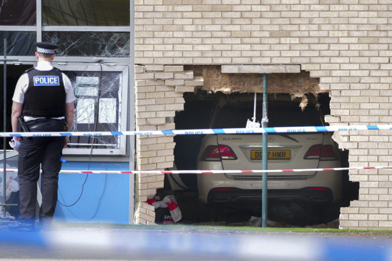V liverpoolskej štvrti Anfield vrazilo auto do budovy školy. Liverpool, 22. apríl 2024. Foto: Peter Byrne/PA via AP