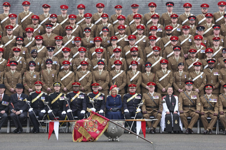 Britská kráľovná Kamila na spoločnej fotografii s príslušníkmi jazdeckého pluku The Royal Lancers. Catterick, 22. apríl 2024. Foto: Chris Jackson/Pool Photo via AP