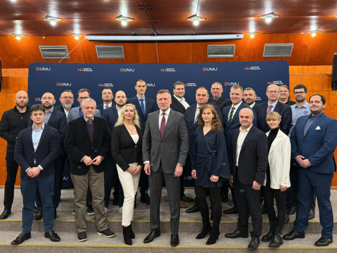 Členovia strany Dunaj počas ustanovujúceho snemu, v rámci ktorého bol kandidát na primátora Bratislavy Martin Winkler (uprostred vľavo), zvolený za predsedu strany Dunaj a zároveň ako líder do komunálnych volieb. Bratislava, 22. január 2026. Foto: SITA/strana Dunaj