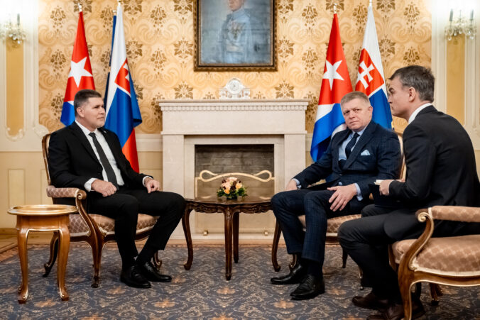 Predseda vlády SR Robert Fico (druhý sprava) a podpredseda vlády a minister zahraničného obchodu a investícií Kubánskej republiky Oscar Pérez-Oliva Fraga (vľavo) počas prijatia kubánskeho ministra zahraničného obchodu a investícií na Úrade vlády SR. Bratislava, 22. január 2026. Foto: SITA/Úrad vlády SR