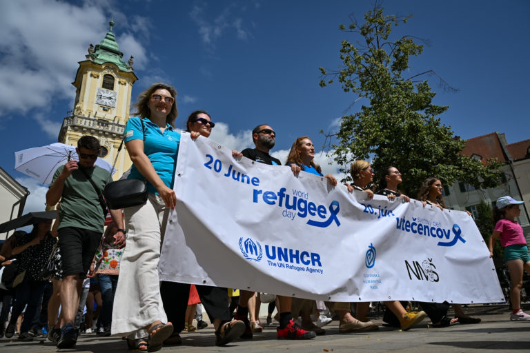 Účastníci Dáždníkového sprievodu v centre hlavného mesta pri príležitosti Svetového dňa utečencov. Bratislava, 22. jún 2024. Foto: SITA.