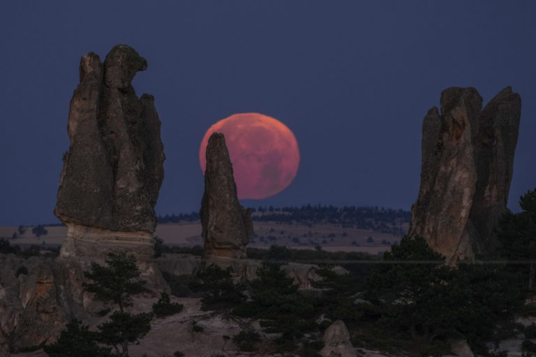 Pohľad na supermesiac, ktorý zapadá za skalnatým útvarom v Afyonkarahisare v západnom Turecku. Foto: SITA/AP.
