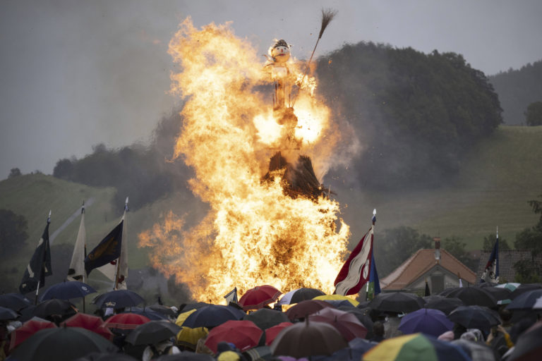 Vo Švajčiarskom Heidene horí "Boeoegg" (symbolicky snehuliak) na konci zimného festivalu. Podľa povery, čím rýchlejšie Boeoegg zhorí, tým horúcejšie bude leto. Foto: Gian Ehrenzeller/Keystone via AP.