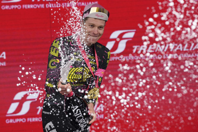 Georg Steinhauser oslavuje po výhre 17. úseku talianskych pretekov Giro d'Italia. Streda, 22. máj, 2024. Foto: Gian Mattia D'Alberto/LaPresse via AP
