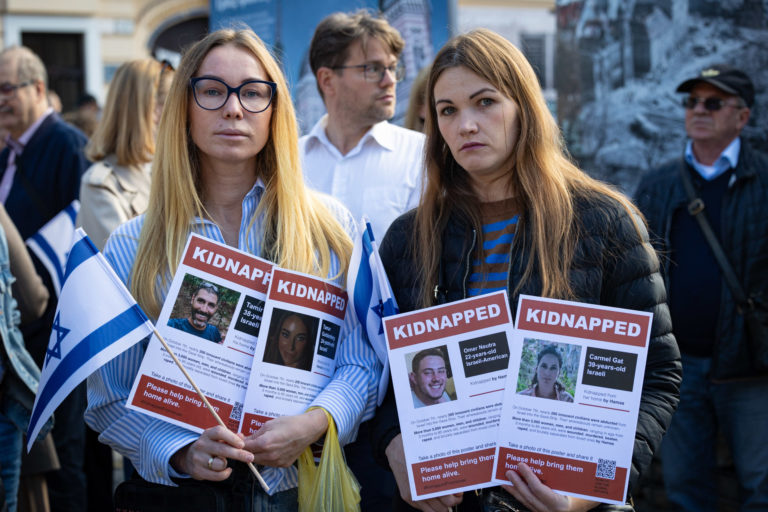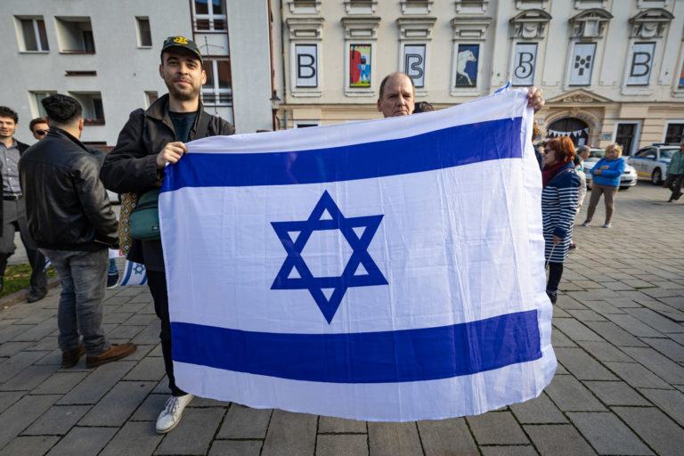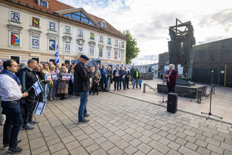 Účastníci počas verejného zhromaždenia na podporu Izraela pri Pamätníku holokaustu na Panskej ulici v Bratislave. Bratislava, 22. október 2023. Foto: SITA/Jana Birošová.