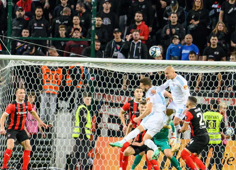 Kevin Wimmer (v bielom vľavo) a Jaba Kankava (v bielom vpravo) z ŠK Slovan Bratislava počas futbalového zápasu 11. kola Niké ligy 2023/2024 medzi FC Spartak Trnava - ŠK Slovan Bratislava. Trnava, 22. október 2023. Foto: SITA/Martin Havran