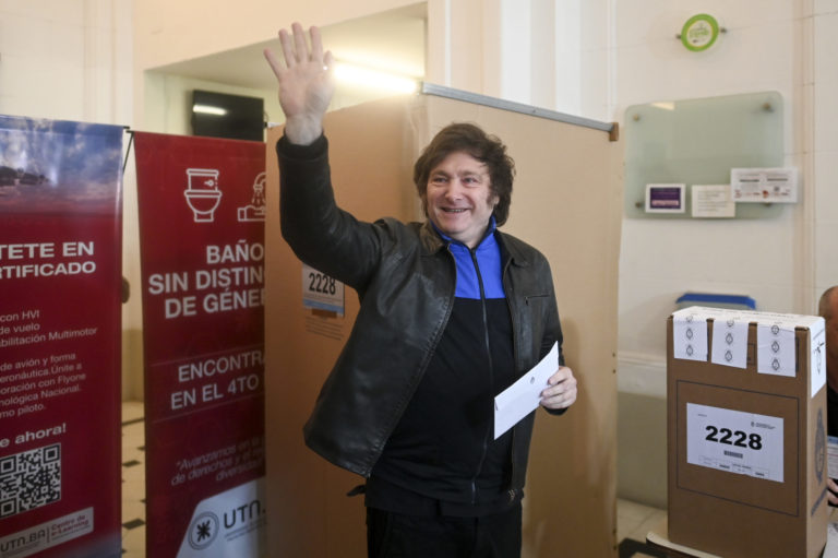 Prezidentský kandidát Javier Milei máva predtým, ako pôjde odovzdať svoj hlas počas volieb v argentínskom Buenos Aires. Foto: SITA/AP.