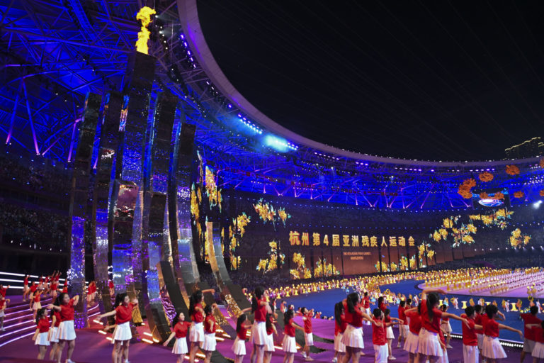 Zapálenie ohňa na otváracom ceremoniály Ázijských paralympijských hier v čínskom Chang-čou. Foto: Jiang Han/Xinhua via AP.