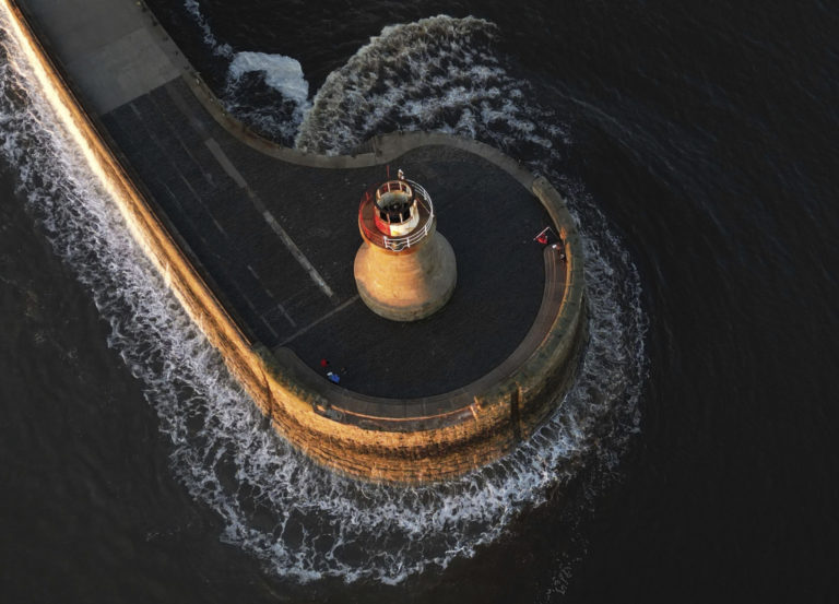 Pohľad na maják South Shields po tom, čo bola v dôsledku búrlivého počasia odtrhnutá kupola. Búrka sužovala Britániu, severné Nemecko a južnú Škandináviu už tretí deň a spôsobila v krajinách záplavy, výpadky elektriny a kolaps dopravy. Foto: Owen Humphreys/PA via AP.