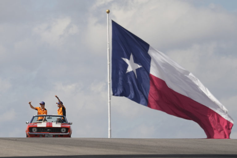 Jazdci McLarenu Oscar Piastri z Austrálie (vľavo) a Lando Norris z Veľkej Británie mávajú počas prehliadky v automobilových pretekoch Veľkej ceny USA formuly 1 na okruhu Circuit of the Americas. Foto: SITA/AP.