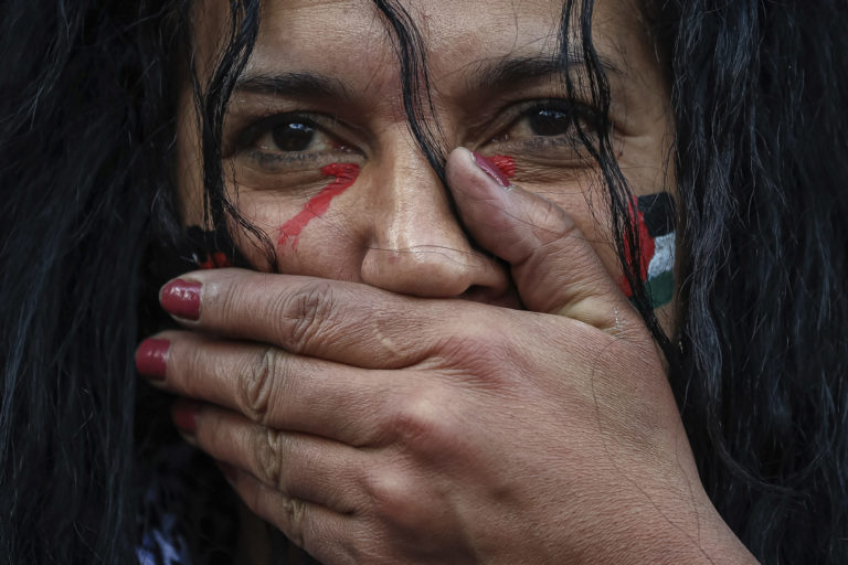 Žena počas minúty ticha na demonštrácii organizovanej "Národným kolektívom za spravodlivý a trvalý mier medzi Palestínčanmi a Izraelčanmi" v Paríži. Foto:SITA/AP.