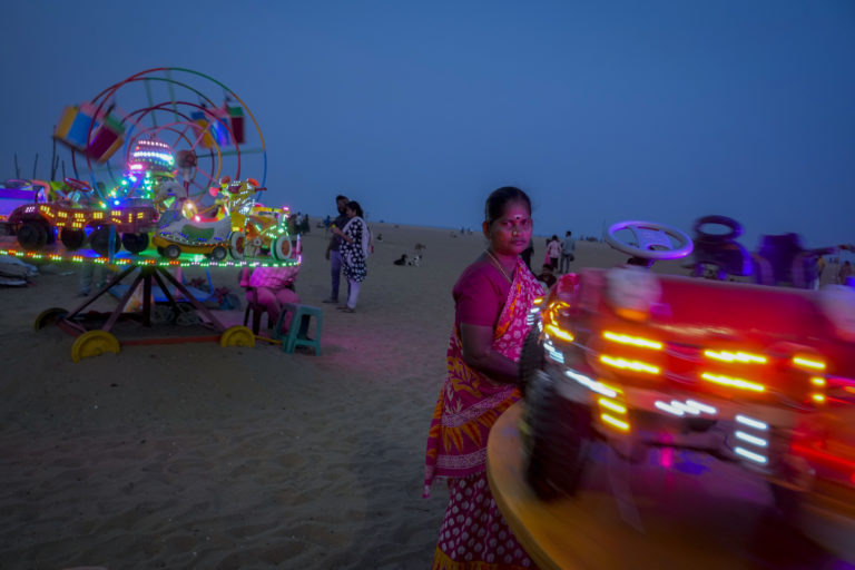 Žena čaká na turistov pri svojich autíčkach pozdĺž pláže Marina v indickom Chennai. Foto: SITA/AP.