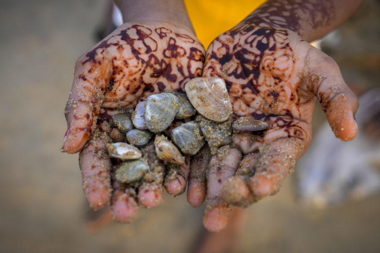 Deti rybárov zbierajú mušle na pláži Marina v Chennai. Foto: SITA/AP.