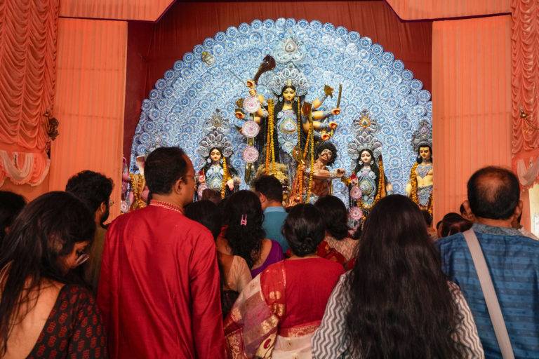 Indovia počas bohoslužby, kedy sa modlia k hinduistickej bohyni Durge. Foto: SITA/AP.