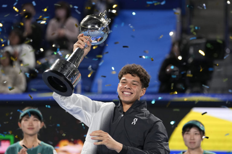 Americký tenista Ben Shelton drží víťaznú trofej po tom, čo porazil Aslana Karatseva z Ruska vo finále dvojhry mužov na tenisových majstrovstvách Japan Open v japonskom Tokiu. Foto: SITA/AP.