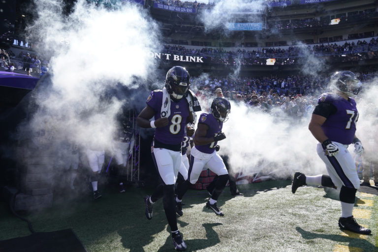 Baltimore Ravens quarterback Lamar Jackson (8) runs onto the field before an NFL football game against the Detroit Lions, Sunday, Oct. 22, 2023, in Baltimore. (AP Photo/Alex Brandon)