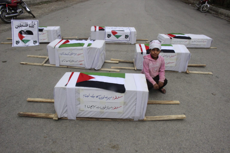 Pakistanský žiak sedí vedľa falošných rakiev počas protestu proti izraelským náletom na pásmo Gazy, aby prejavil solidaritu s palestínskym ľudom. Foto: SITA/AP.