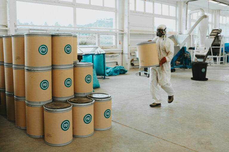 Nádoby s vláknom, zrecyklované spoločnosťou Reneso zo zvyškov tabakových výrobkov, ktoré Bratislavský samosprávny kraj (BSK) využije spolu so stavebnou spoločnosťou STRABAG v asfalte pri inovatívnom cestnom projekte v Malinove. Pokládka sa uskutoční 27. októbra 2025 o 10:00 na ceste II/121. Bratislava, 22. október 2025. Foto: SITA/RENESO