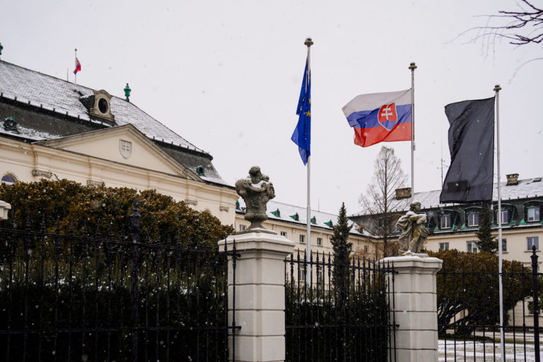 Vztýčená čierna vlajka pred Prezidentským palácom na znak vyjadrenia solidarity s Českou republikou, ktorá má dnes štátny smútok v súvislosti s tragickou streľbou na Filozofickej fakulte Univerzity Karlovej v Prahe. Bratislava, 23. december 2023. Foto: SITA/Milan Illík.