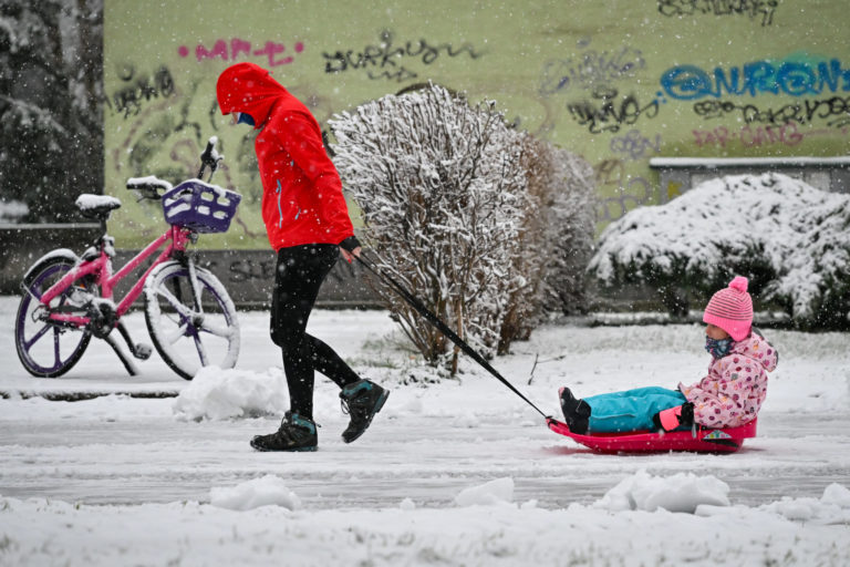Žena ťahá dieťa na saniach počas sneženia v ružinovskom parku Ostredky v Bratislave. Bratislava, 23. december 2023. Foto: SITA/Michal Veterník.