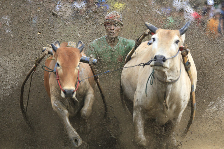 A participant takes part in a bull race competition called 'Pacu Jawi' in Tanah Datar, West Sumatra, Indonesia. Originally held annually to celebrate rice harvest, the event has now become a major tourist attraction in the region. Foto: SITA/AP.