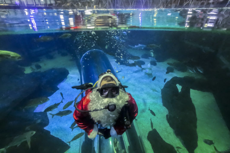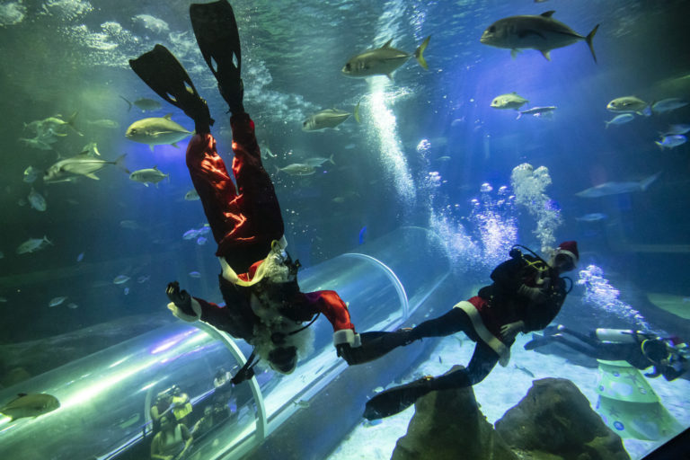 Divers dressed as Santa Claus and Mother Christmas swim inside a shark tank at the AquaRio marine aquarium, in Rio de Janeiro, Brazil. Their performances have become an annual Christmas tradition. Foto: SITA/AP.