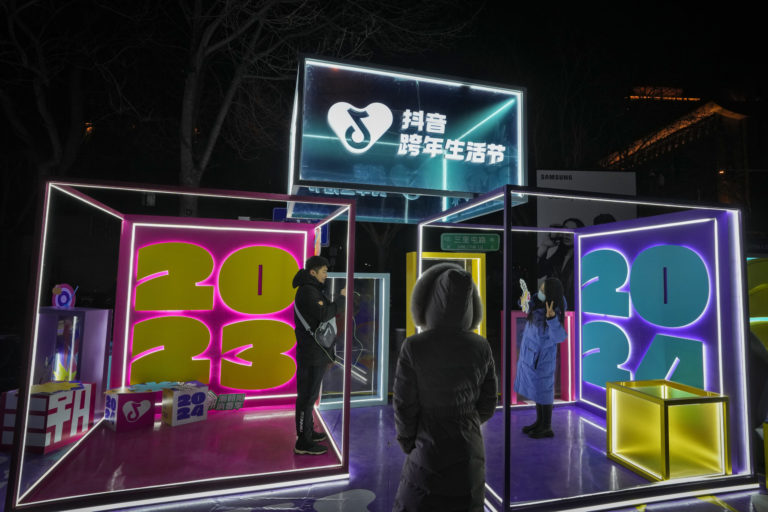 A woman looks at a man taking a souvenir picture of his partner at a lights display by Douyin, the Chinese sister app of TikTok promoting the upcoming New Year's Eve set up at an outdoor shopping mall in Beijing. Foto: SITA/AP.