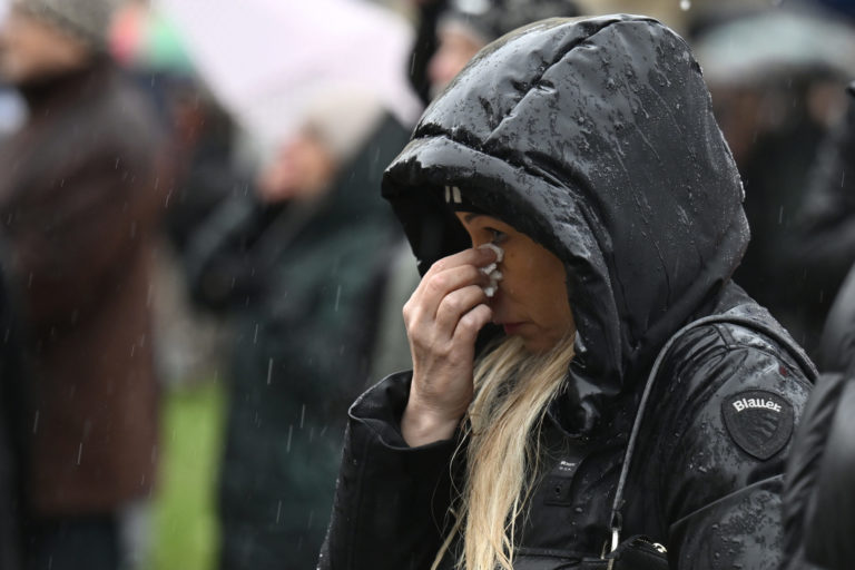 A mourner wipes her eyes in front of the building of Philosophical Faculty of Charles University in downtown Prague, Czech Republic. Foto: SITA/AP.
