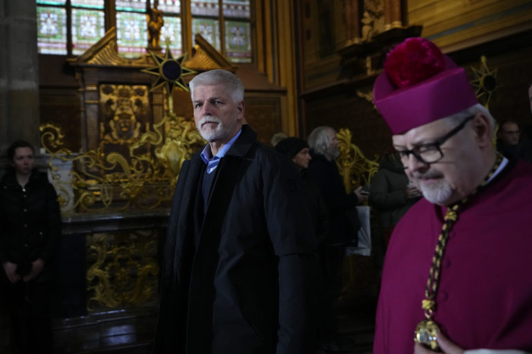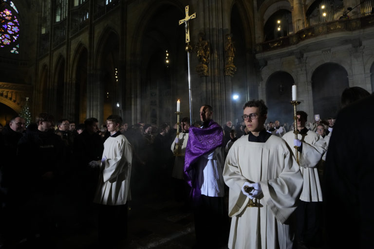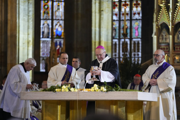 Prague Archbishop Jan Graubner, centre, holds the chalice during service for the victims of Philosophical Faculty of Charles University shooting in the St. Vitus Cathedral in Prague, Czech Republic. Czech police are investigating why a student went on a dayslong violent rampage culminating in a shooting at the university he attended in Prague that left 14 dead and dozens wounded. Foto: SITA/AP.