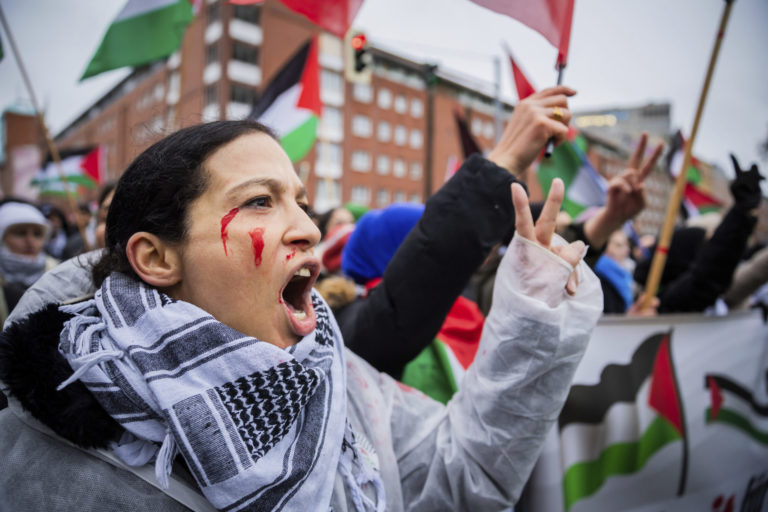 A participant chants slogans for the freedom of Gaza during a demonstration under the slogan "Germany-wide solidarity with Palestine" in Berlin, Germany. Foto: Christoph Soeder/dpa via AP.