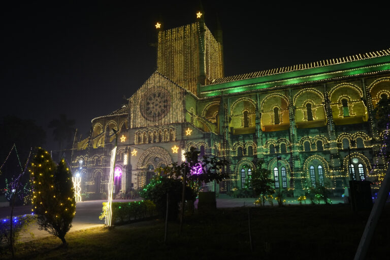 People visit the All Saints Cathedral, illuminated to mark Christmas, in Prayagraj, India, Foto: SITA/AP.