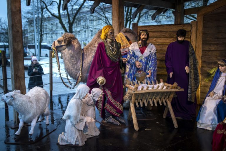 People stand at the Nativity scene installed for upcoming Christmas celebrations in Cathedral Square in Vilnius,Lithuania. Foto: SITA/AP.