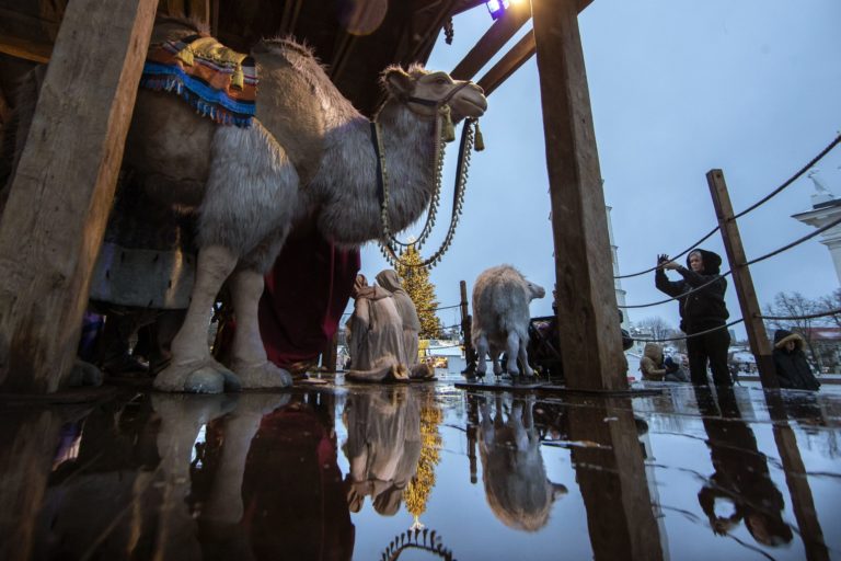 A woman photographs the Nativity scene installed for upcoming Christmas celebrations in Cathedral Square in Vilnius, Lithuania. Foto: SITA/AP.