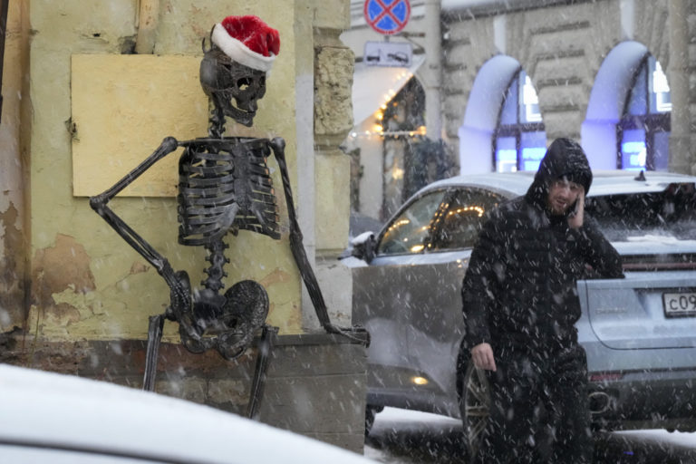 A man walks past an iron skeleton standing at the entrance to a clothing store and wearing a Santa Claus hat, in St. Petersburg, Russia. Foto: SITA/AP.