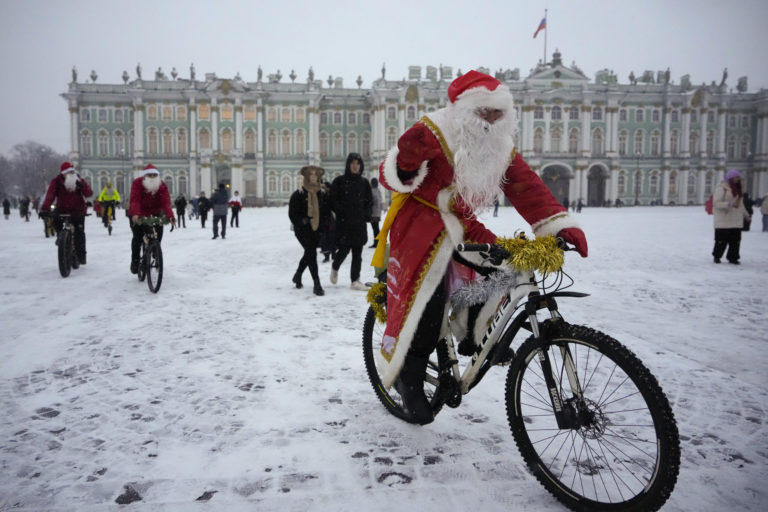 Men dressed as Ded Moroz' (Grandfather Frost, the Russian Santa Claus) ride bicycles at the Palace Square in St. Petersburg, Russia. Foto: SITA/AP.
