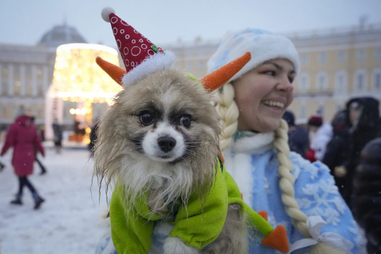 A woman dressed as Snow Maiden holds her dog at the Palace Square decorated prior to incoming Christmas and New Year festivities in St. Petersburg, Russia. Foto: SITA/AP.