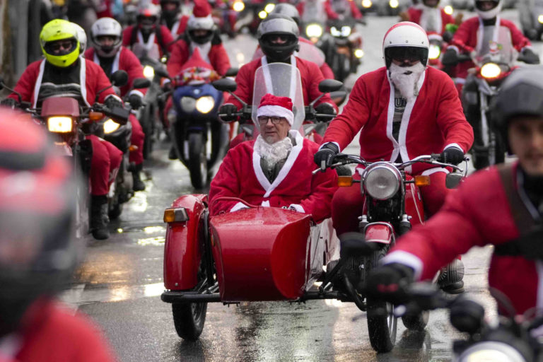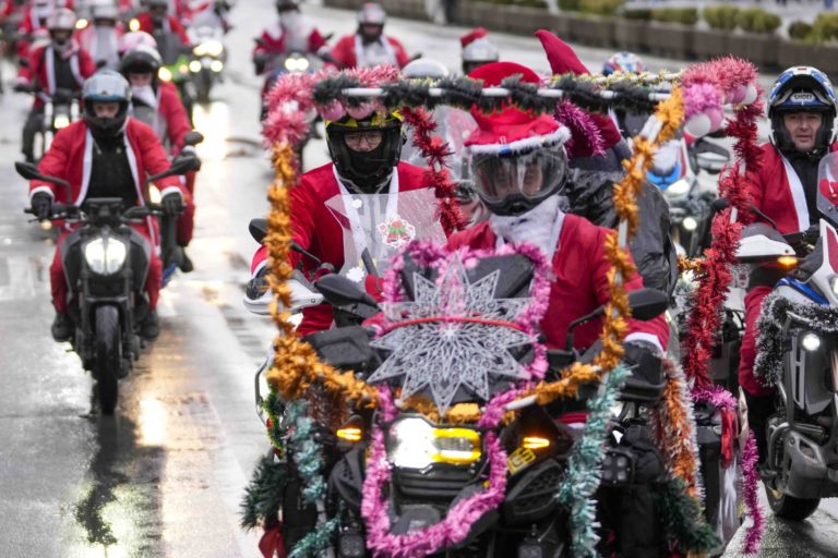Bikers wearing Santa Claus costumes ride their bikes during a Santa Claus parade as they travel to a children's hospital to deliver toys to patients in Belgrade, Serbia. Foto: SITA/AP.
