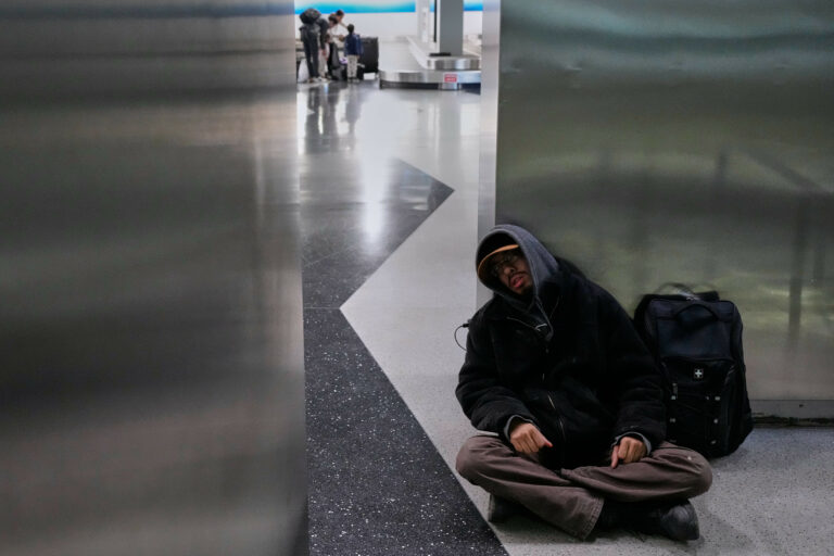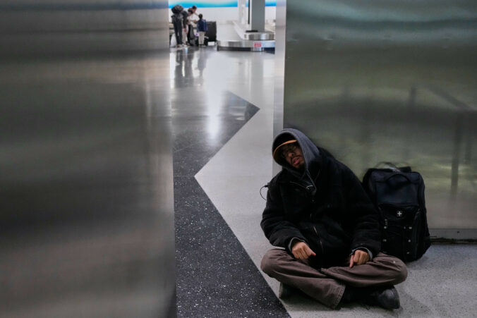 Cestujúci sedí a spí počas čakania na svoj let na letisku O'Hare. Chicago, 23. decembra 2025. Foto: AP Photo/Nam Y. Huh