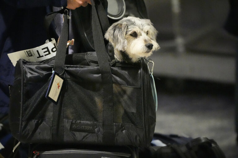 Abbey, 15-ročná kríženka teriéra, čaká v prepravke so svojou majiteľkou Lynne Conroe z Fredericksburgu vo Virgínii pri výdaji batožiny na medzinárodnom letisku v Denveri. Colorado, 19. decembra 2025. Foto: AP Photo/David Zalubowski