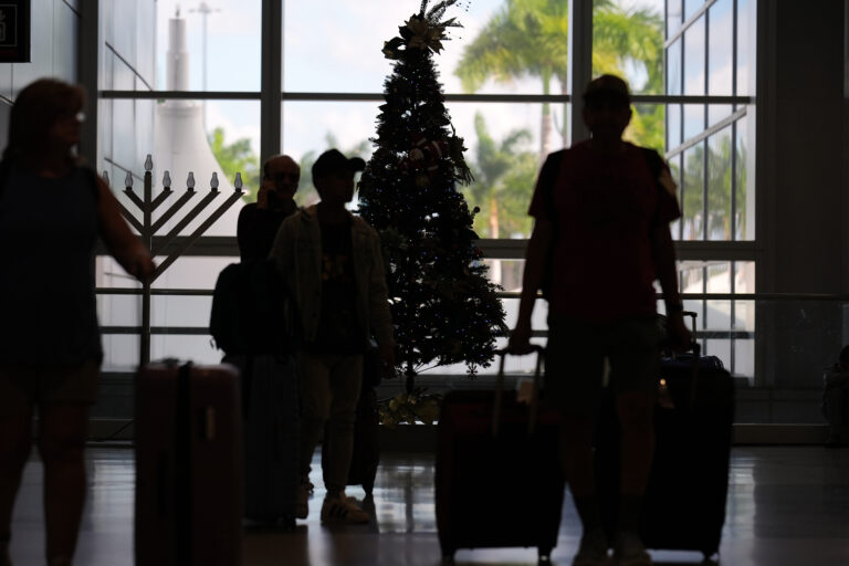 Cestujúci prechádzajú okolo vianočného stromčeka a chanukového menory na medzinárodnom letisku v Miami, Florida, 22. decembra 2025. Foto: AP Photo/Rebecca Blackwell