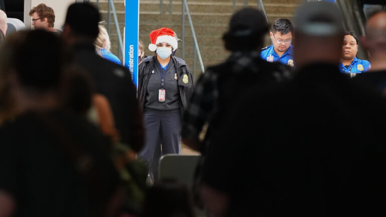 Agenti TSA sú pripravení, keď cestujúci prechádzajú bezpečnostnou kontrolou na letisku Love Field, Dallas,22. decembra 2025. Foto: AP Photo/LM Otero