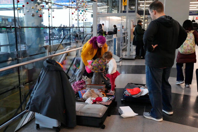 Cestujúci si kontrolujú batožinu, aby znížili hmotnosť, predtým ako idú k prepážke s lístkami na letisku O'Hare. Chicago, 23. decembra 2025. Foto: AP Photo/Nam Y. Huh