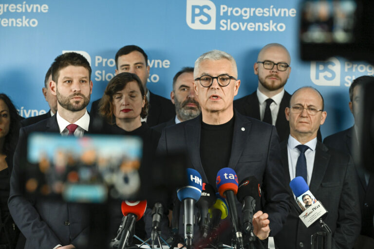 Sprava v popredí: Člen predsedníctva PS Ivan Korčok a predseda PS Michal Šimečka počas tlačovej besedy strany Progresívne Slovensko (PS) na tému: Reakcia na cestu Roberta Fica do Moskvy. Bratislava, 23. december 2024. Foto: archívne, SITA/Milan Illík