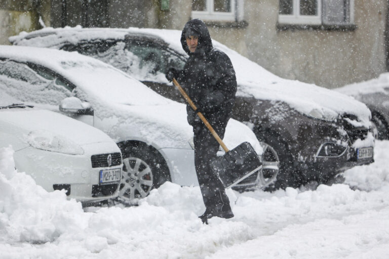 Muž odhŕňa sneh z ulice počas hustého sneženia v Bosne. Bihač, 23. december 2024. Foto: SITA/AP