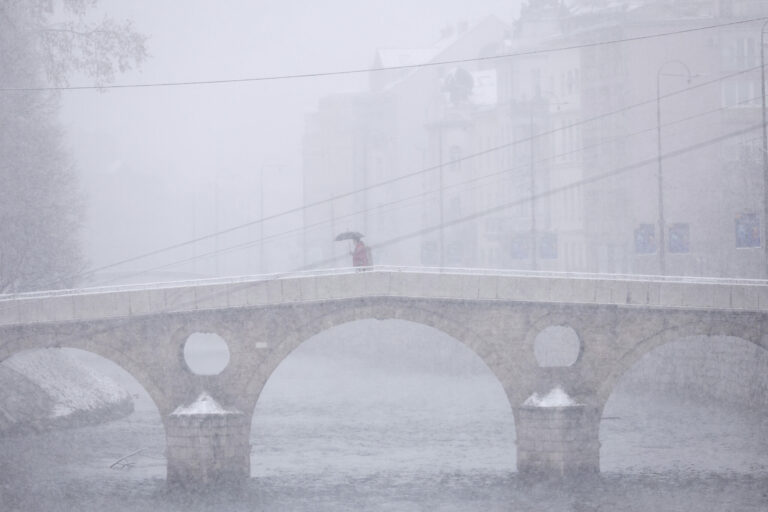 Muž prechádza cez most počas hustého sneženia v centre Sarajeva v Bosne. 23. december 2024. Foto: SITA/AP