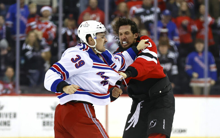 Center New York Rangers Sam Carrick (vľavo) a obranca New Jersey Devils Brenden Dillon sa pobili počas zápasu zámorskej NHL. Newark, 23. december 2024. Foto: SITA/AP